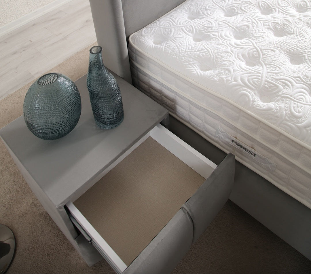 Doté de systèmes de vérins d'amortissements renforcés, de 12 pieds inoxydables répartis sous le coffre, de 2 poignets métalliques pour une utilisation aisée des doubles coffres relevables, et d'une structure de coffre en métal travaillé ingénieusement, ce lit offre un confort exceptionnel et une praticité remarquable.