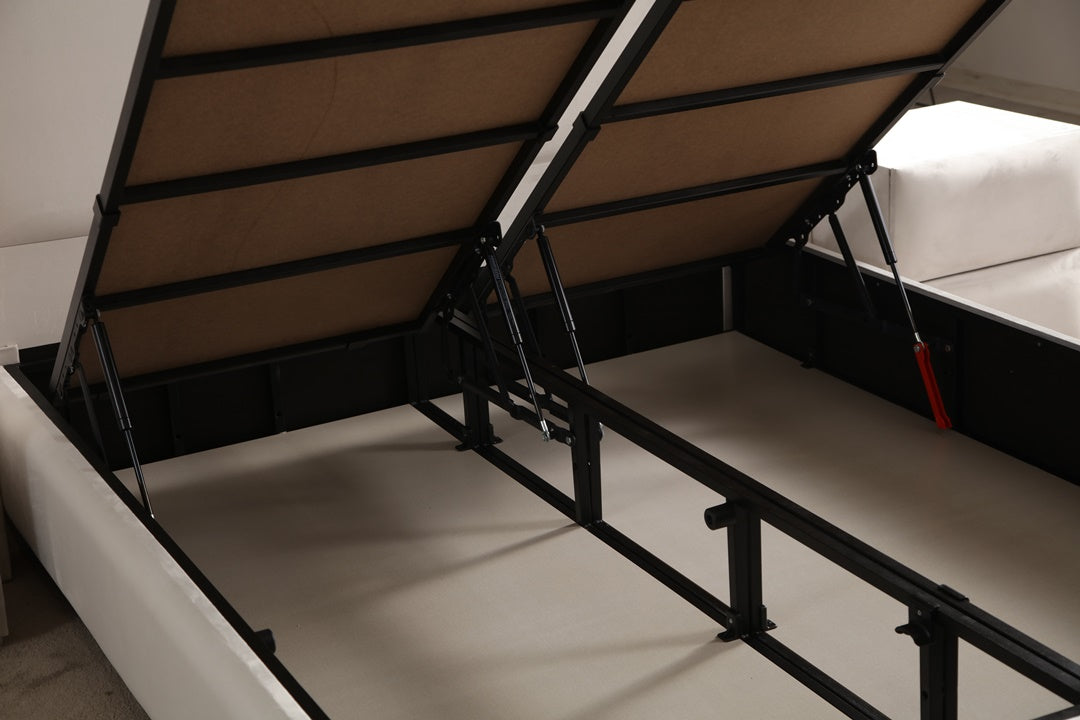 Doté de systèmes de vérins d'amortissements renforcés, de 12 pieds inoxydables répartis sous le coffre, de 2 poignets métalliques pour une utilisation aisée des doubles coffres relevables, et d'une structure de coffre en métal travaillé ingénieusement, ce lit offre un confort exceptionnel et une praticité remarquable.