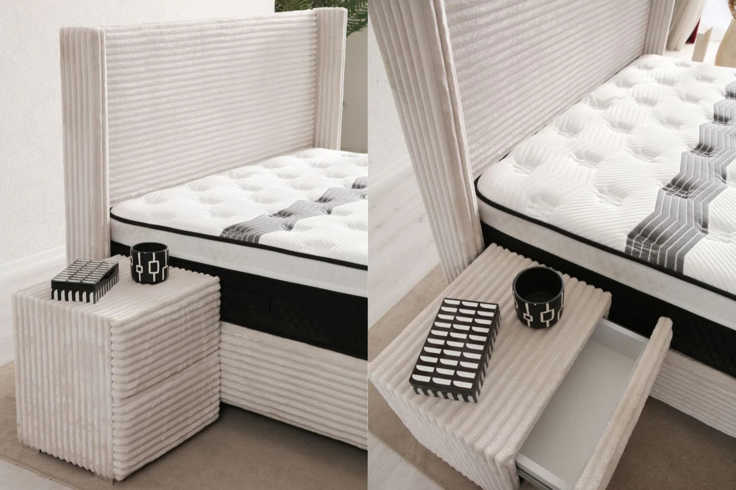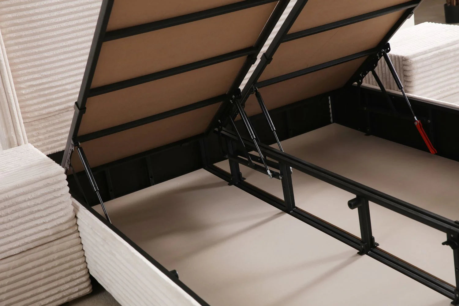 Doté de systèmes de vérins d'amortissements renforcés, de 12 pieds inoxydables répartis sous le coffre, de 2 poignets métalliques pour une utilisation aisée des doubles coffres relevables, et d'une structure de coffre en métal travaillé ingénieusement, ce lit offre un confort exceptionnel et une praticité remarquable.
