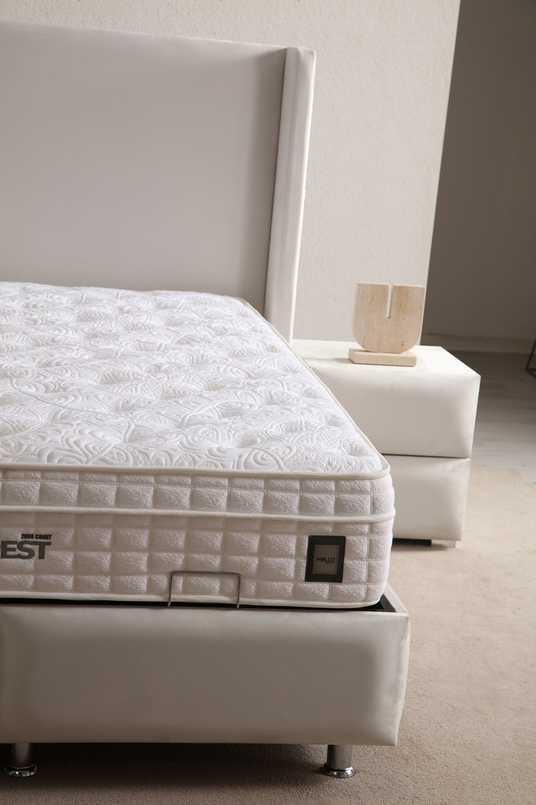 Doté de systèmes de vérins d'amortissements renforcés, de 12 pieds inoxydables répartis sous le coffre, de 2 poignets métalliques pour une utilisation aisée des doubles coffres relevables, et d'une structure de coffre en métal travaillé ingénieusement, ce lit offre un confort exceptionnel et une praticité remarquable.