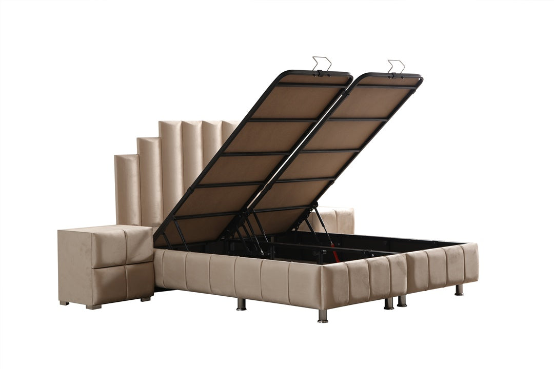 Doté de systèmes de vérins d'amortissements renforcés, de 12 pieds inoxydables répartis sous le coffre, de 2 poignets métalliques pour une utilisation aisée des doubles coffres relevables, et d'une structure de coffre en métal travaillé ingénieusement, ce lit offre un confort exceptionnel et une praticité remarquable.