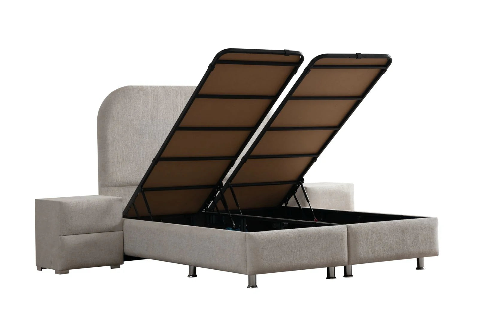 Doté de systèmes de vérins d'amortissements renforcés, de 12 pieds inoxydables répartis sous le coffre, de 2 poignets métalliques pour une utilisation aisée des doubles coffres relevables, et d'une structure de coffre en métal travaillé ingénieusement, ce lit offre un confort exceptionnel et une praticité remarquable.