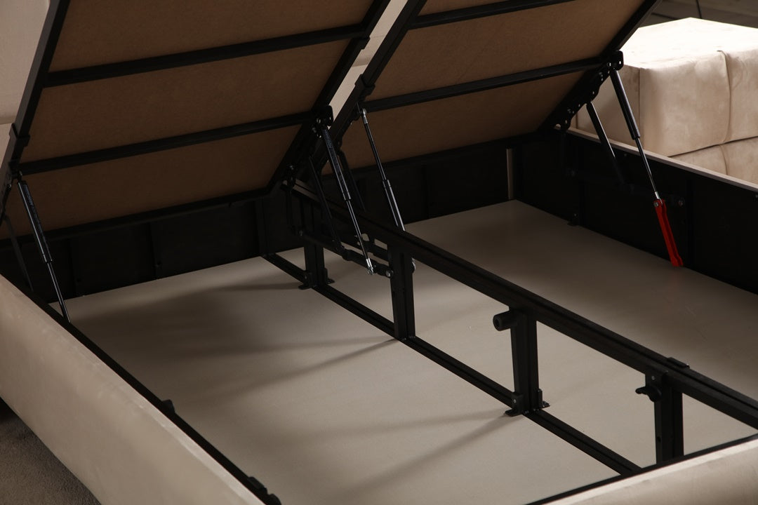 Doté de systèmes de vérins d'amortissements renforcés, de 12 pieds inoxydables répartis sous le coffre, de 2 poignets métalliques pour une utilisation aisée des doubles coffres relevables, et d'une structure de coffre en métal travaillé ingénieusement, ce lit offre un confort exceptionnel et une praticité remarquable.